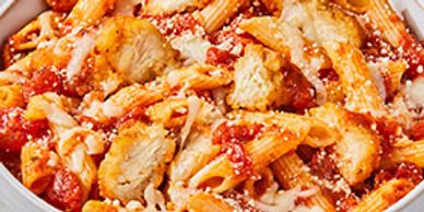 Breaded chicken on Penne noodles with marinara. Finished with mozzarella and Pecorino Romano cheeses.