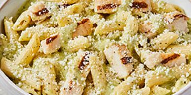 Grilled chicken strips on Penne noodles with creamy basil pesto and finished with Pecorino Romano cheese.
